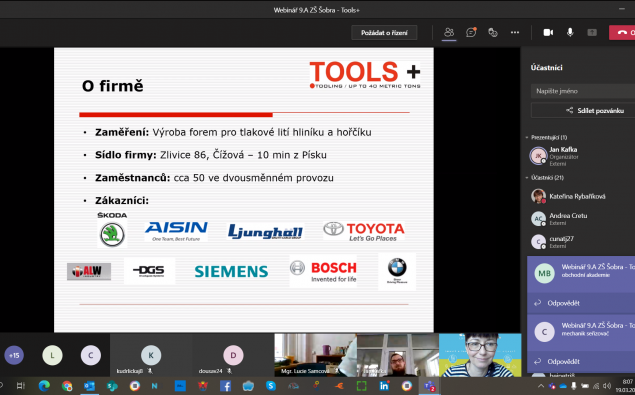 Ve spolupráci s firmou Tools + s.r.o. jsme připravili online workshop pro žáky Základní škola Tomáše Šobra a Mateřská škola Písek, Šobrova 2070Během workshopu se žáci seznámí s firmou Tools + s.r.o., která vyrábí vysoce přesné nástroje pro tlakové lití dílů z hliníku a hořčíku.