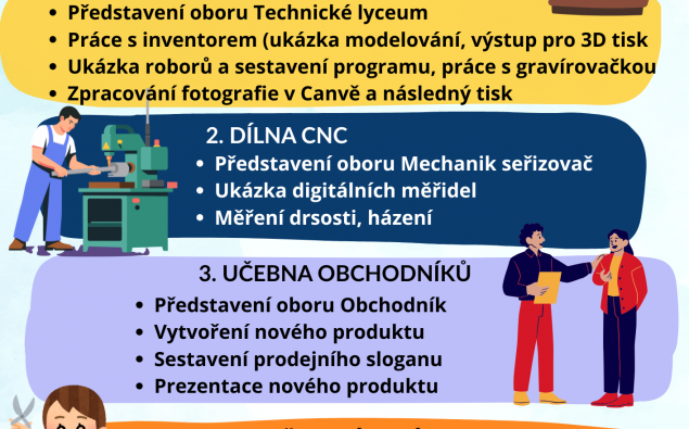 Pro žáky ZŠ Kunžak jsme připravili workshop ve spolupráci se Střední školou technickou a obchodní Dačice, kde si budou moci vyzkoušet různé obory jako obchodník, mechanik seřizovač, truhlář, kadeřník nebo technické lyceum.Co žáky čeká?